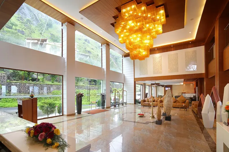 The ambience is one of understated elegance—think warm wooden textures, expansive glass facades, and open-air corridors that invite the crisp mountain air. As a 5-star hotel in Munnar, the property is dedicated to providing a tranquil escape from the urban hustle, making it a sanctuary for wellness seekers and nature enthusiasts alike.
