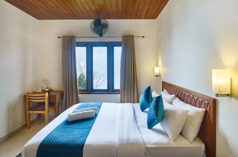 Deshadan Mountain Resort features 22 meticulously designed rooms and cottages, each offering a private portal to the mountains. The interiors focus on warmth and comfort, featuring vitrified tiles, wooden ceilings, and large windows to frame the majestic landscape.