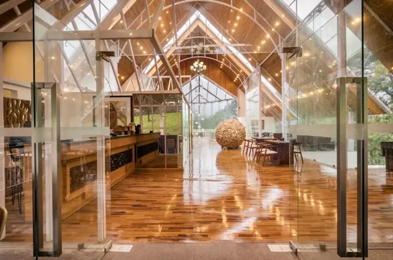 The resort features 45 thoughtfully designed rooms and villas with modern amenities, private balconies, and stunning views of the Western Ghats: