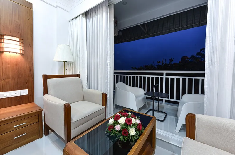 Each room is spacious, airy, and equipped with contemporary amenities. One of the most attractive features is the private balcony attached to every room, offering sweeping views of the surrounding tea gardens and hills. Whether you’re sipping morning tea or unwinding after a day of sightseeing, the balcony ensures an unforgettable experience.