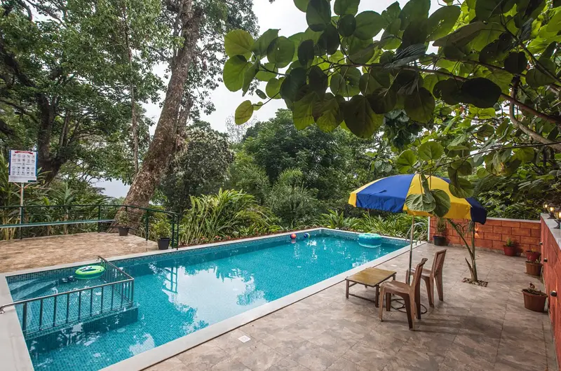 • Swimming Pool: An outdoor pool surrounded by lush greenery.
