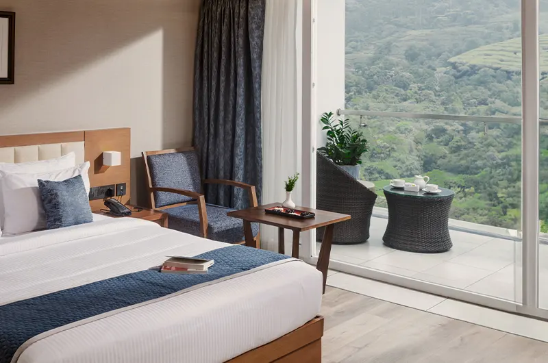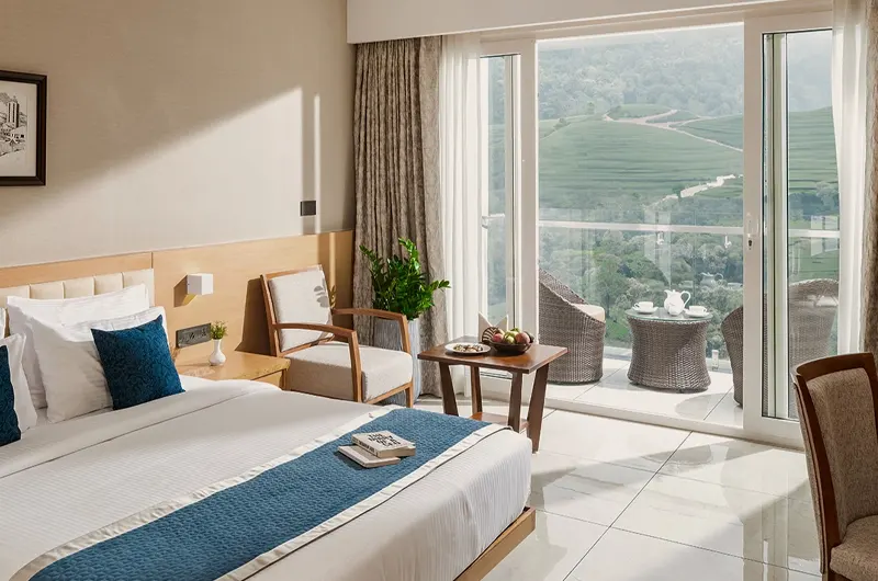 Rooms are equipped with modern amenities including air conditioning, Wi-Fi, balcony / veranda, en suite bathrooms, and scenic views of gardens, tea estates, or hills.