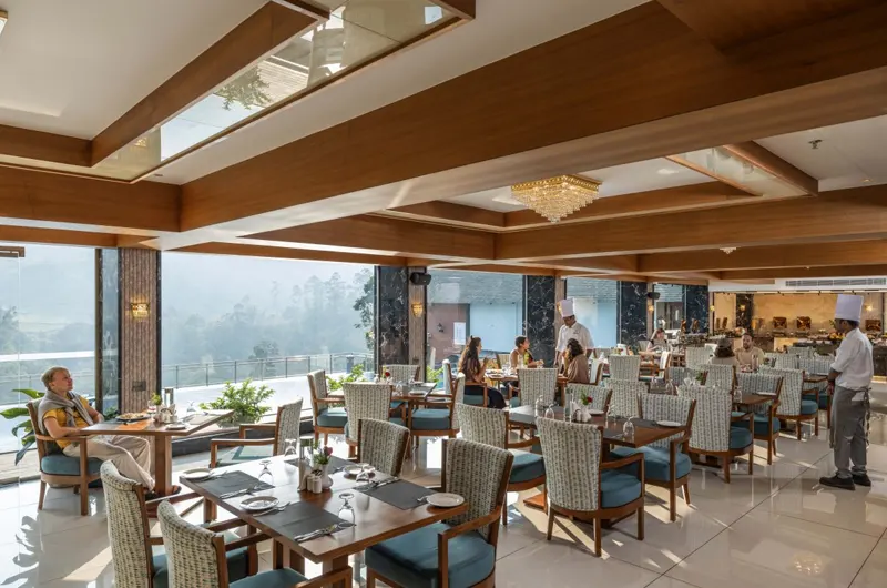 - Combines luxury and nature — located between dense forest and Western Ghats, with scenic tea plantations all around Panoramic Views from rooms, infinity pool, and open spaces